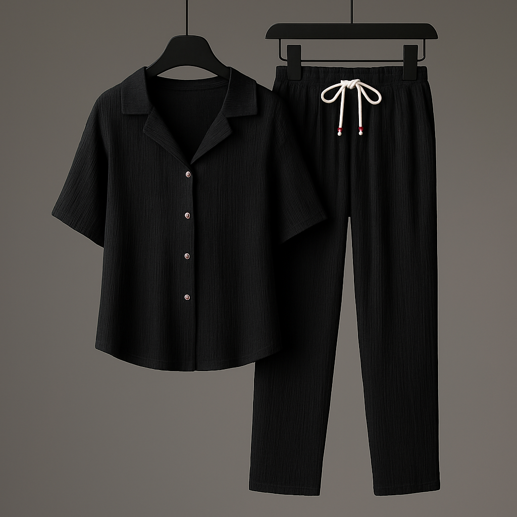 Crafted from a lightweight textured cotton blend, this relaxed set brings easygoing comfort with a refined look. The shirt’s open collar and the drawstring pants combine laid-back styling with breathable structure that moves with you from morning coffee to late-night lounging.