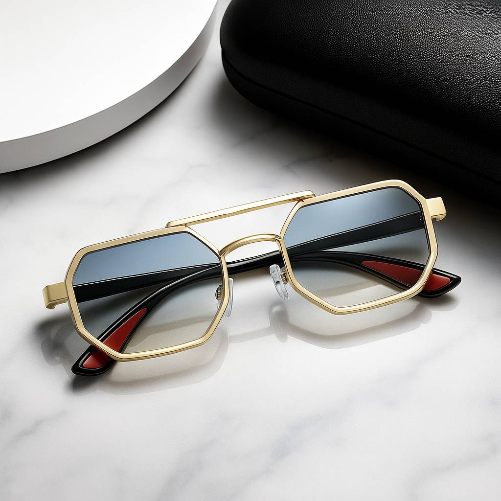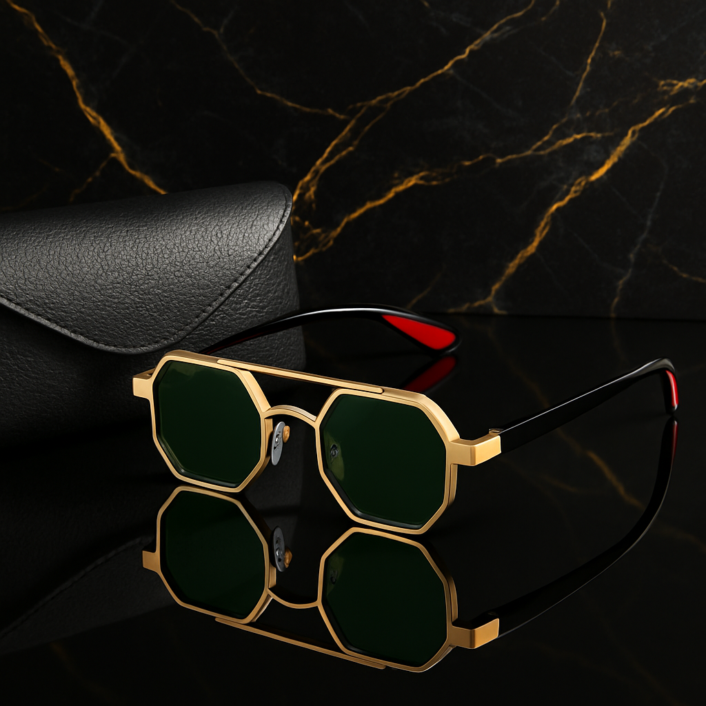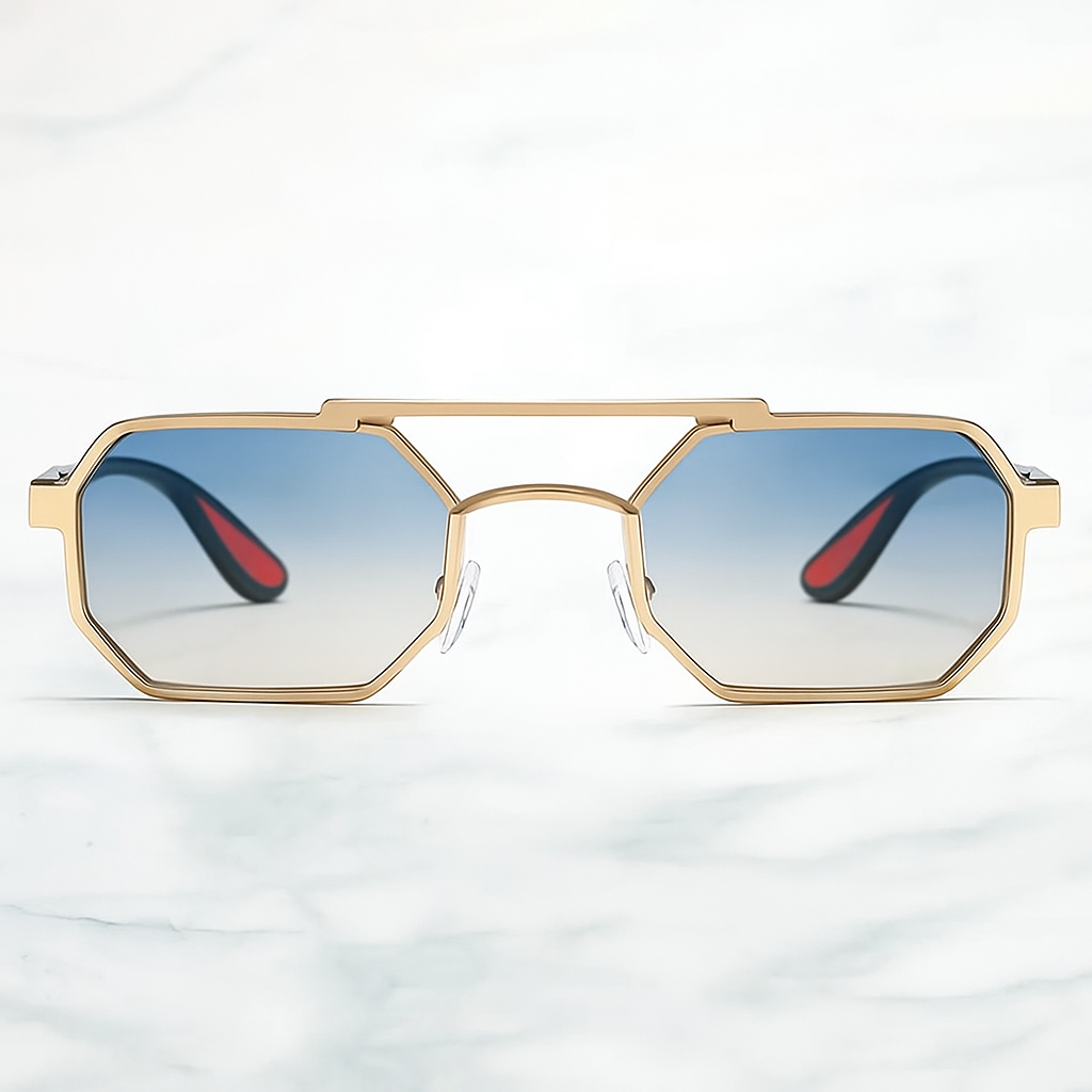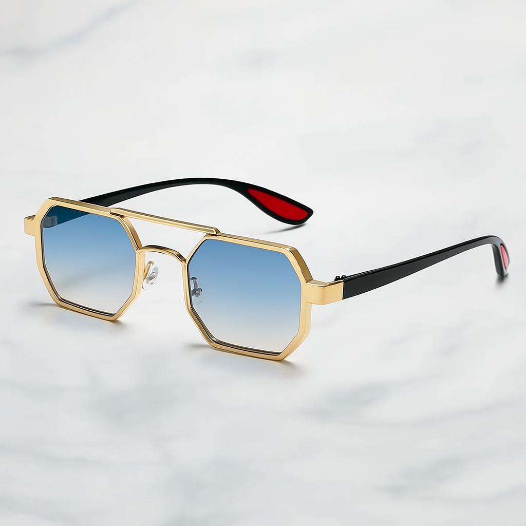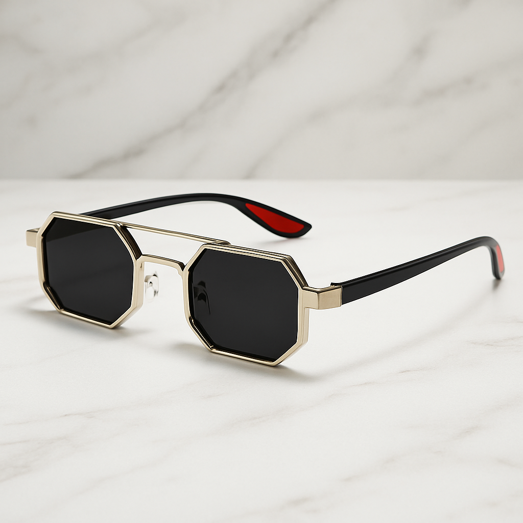 Crafted with precision-cut titanium alloy, these sunglasses feature bold octagonal lenses that instantly stand out. Lightweight arms with red inner tips and adjustable nose pads provide all-day ease, whether you're poolside or city-bound.