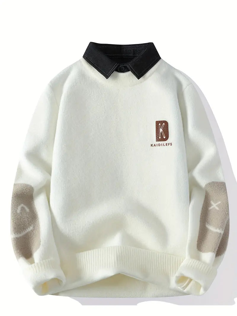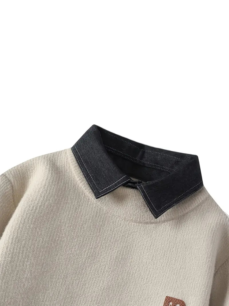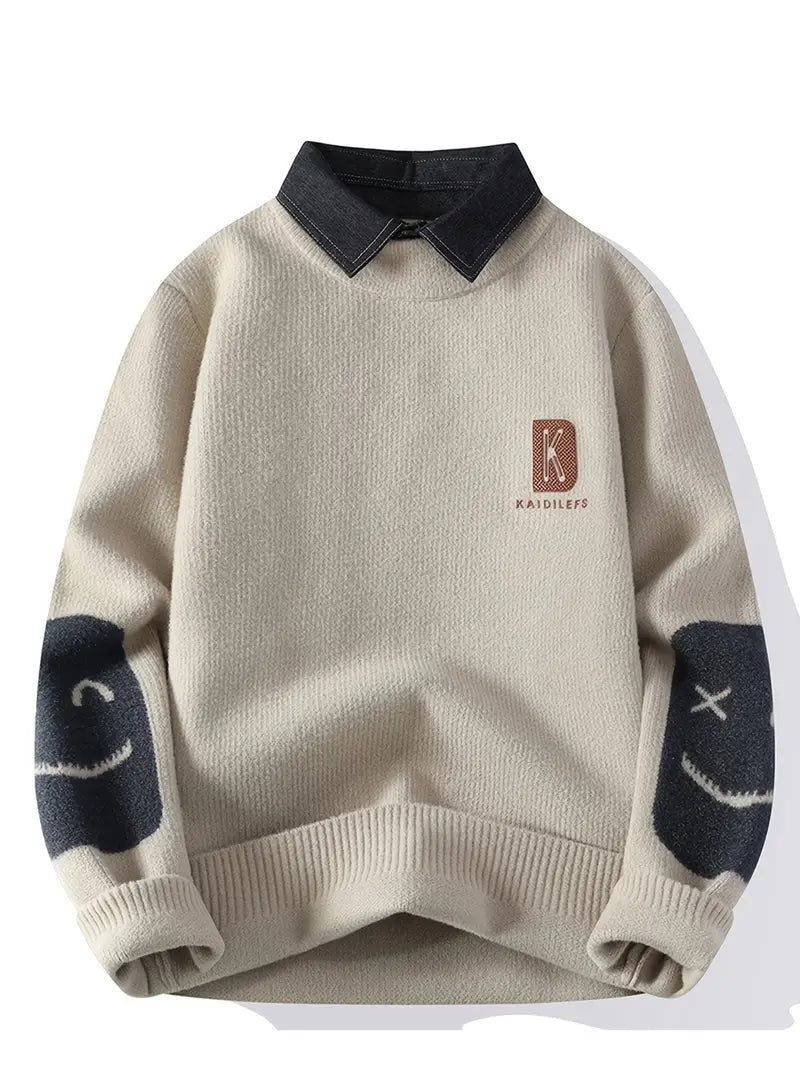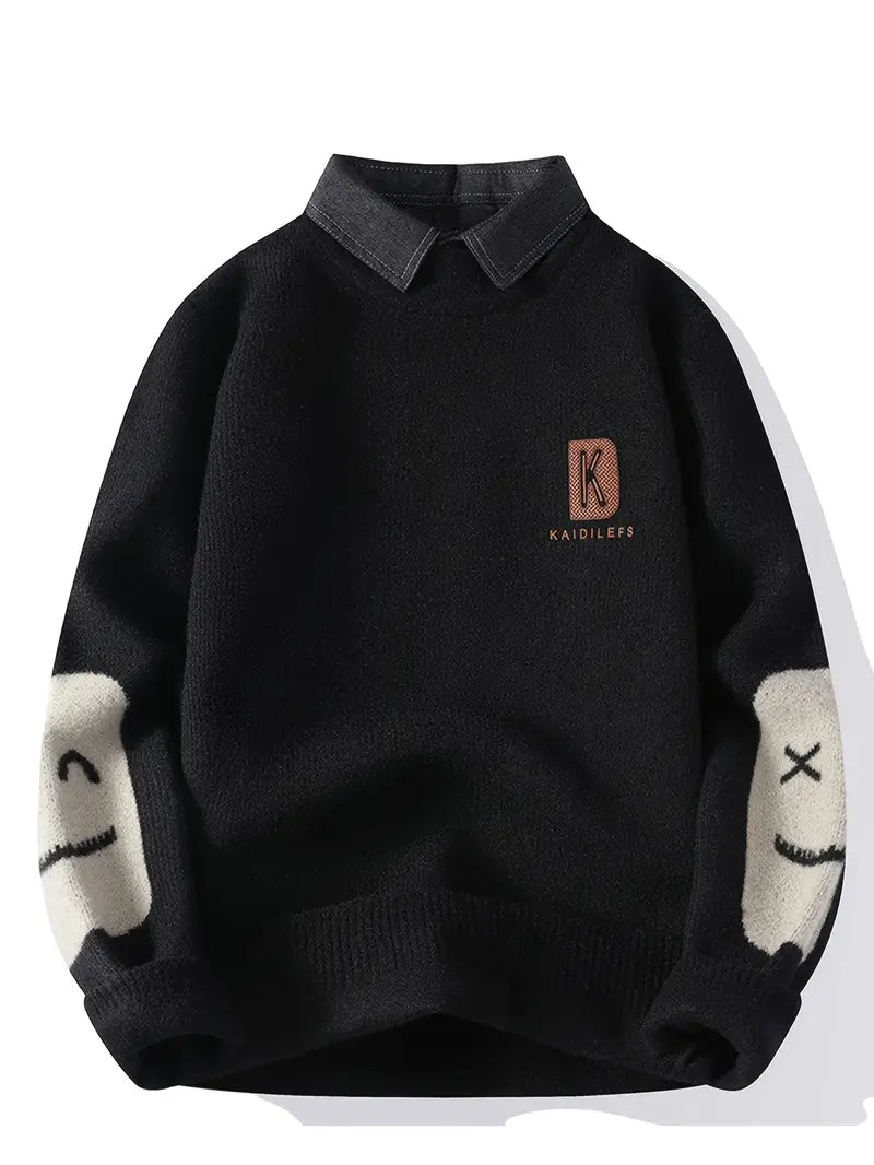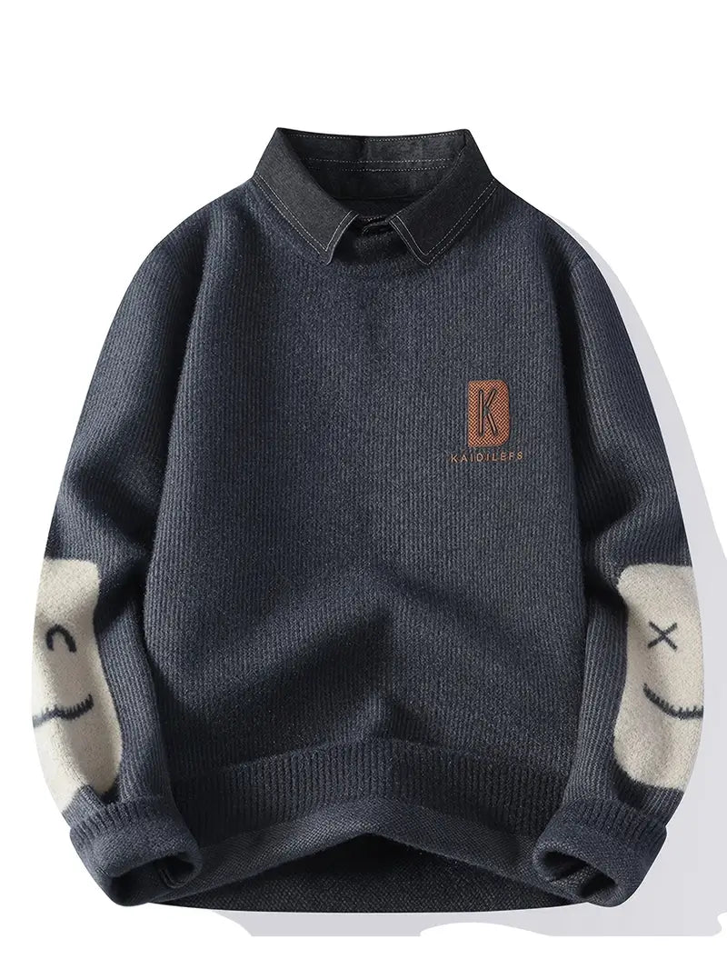 This two-piece set combines a crisp contrast-collar shirt with a soft premium wool-blend sweater, giving you an instantly layered look without the bulk. Playful smiley graphics at the elbows bring character, while the timeless pairing transitions easily from casual outings to laid-back evenings.