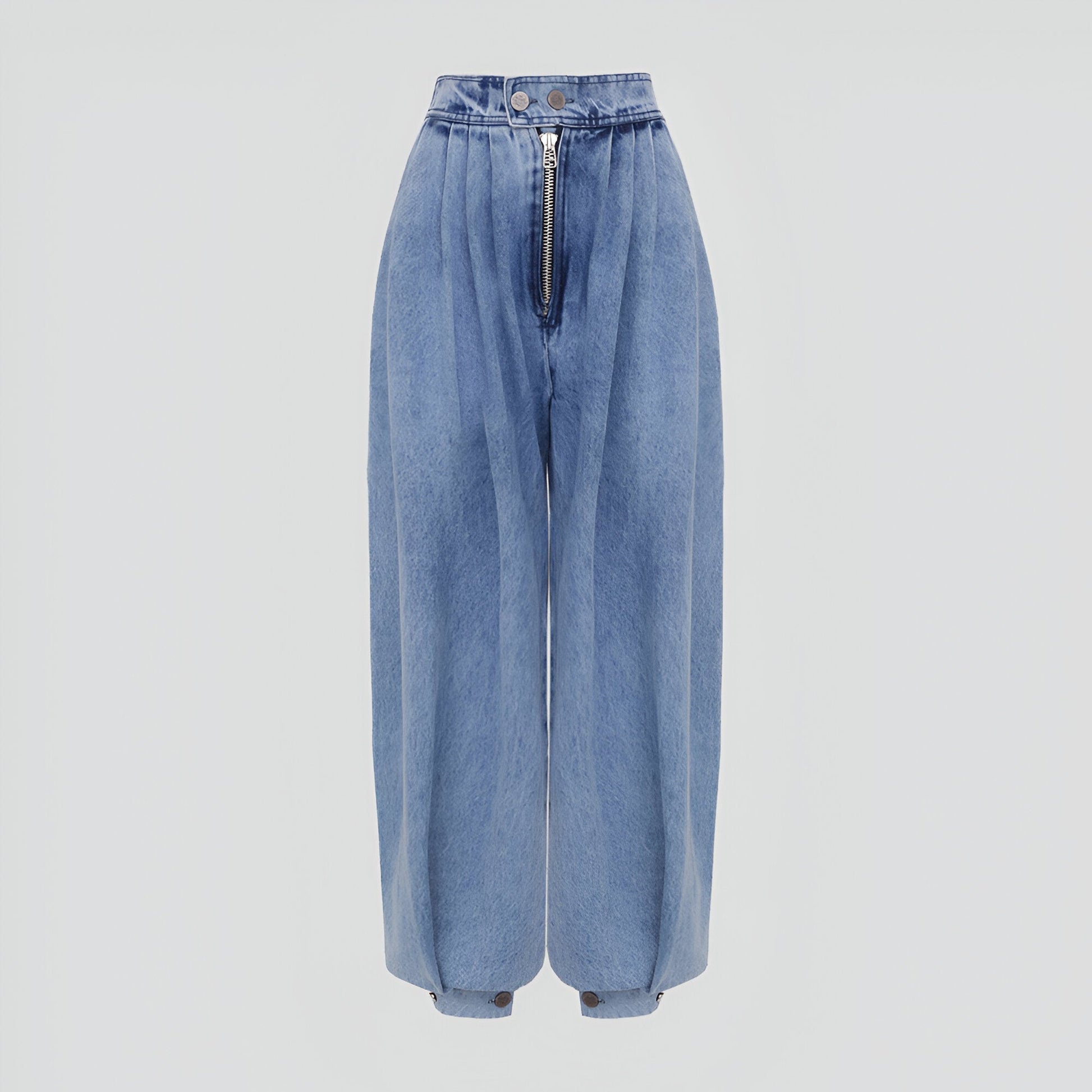 Made from soft-washed premium denim, these high waist balloon pants shape the body with bold volume and deep front pleats. The wide-leg silhouette tapers at the ankle with a snap cuff finish, creating a striking contrast in every step.
